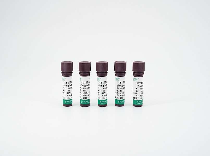 MTT全称为3-(4,5-dimethyl-2-thiazolyl)-2,5-diphenyl-2-H-tetrazolium bromide,汉语化学名为 3-45-二甲基噻唑-2-25-二苯基四氮唑溴盐,商品名:噻唑蓝,是一种黄颜色的染料。MTT能够检测细胞存活和生长,其检测原理为:活细胞线粒体中的琥珀酸脱氢酶,能使外源性MTT还原为不溶于水的蓝紫色结晶物--甲瓒(Formazan),并沉积在细胞中,而死细胞则无此功能;二甲基亚砜(DMSO)能溶解细胞中的甲瓒,用酶标仪在490nm570nm波长处(常用490nm)测定其光吸收值(OD值),通过OD值的大小,可以判断活细胞的数量或活性,在一定细胞数范围内,MTT结晶形成的量与活细胞的数量或活性成正比。该方法的特点是灵敏度高,并且十分经济,已广泛应用于一些生物活性因子的活性检测、大规模的抗肿瘤药物筛选、细胞毒性试验以及肿瘤放射敏感性测定等。